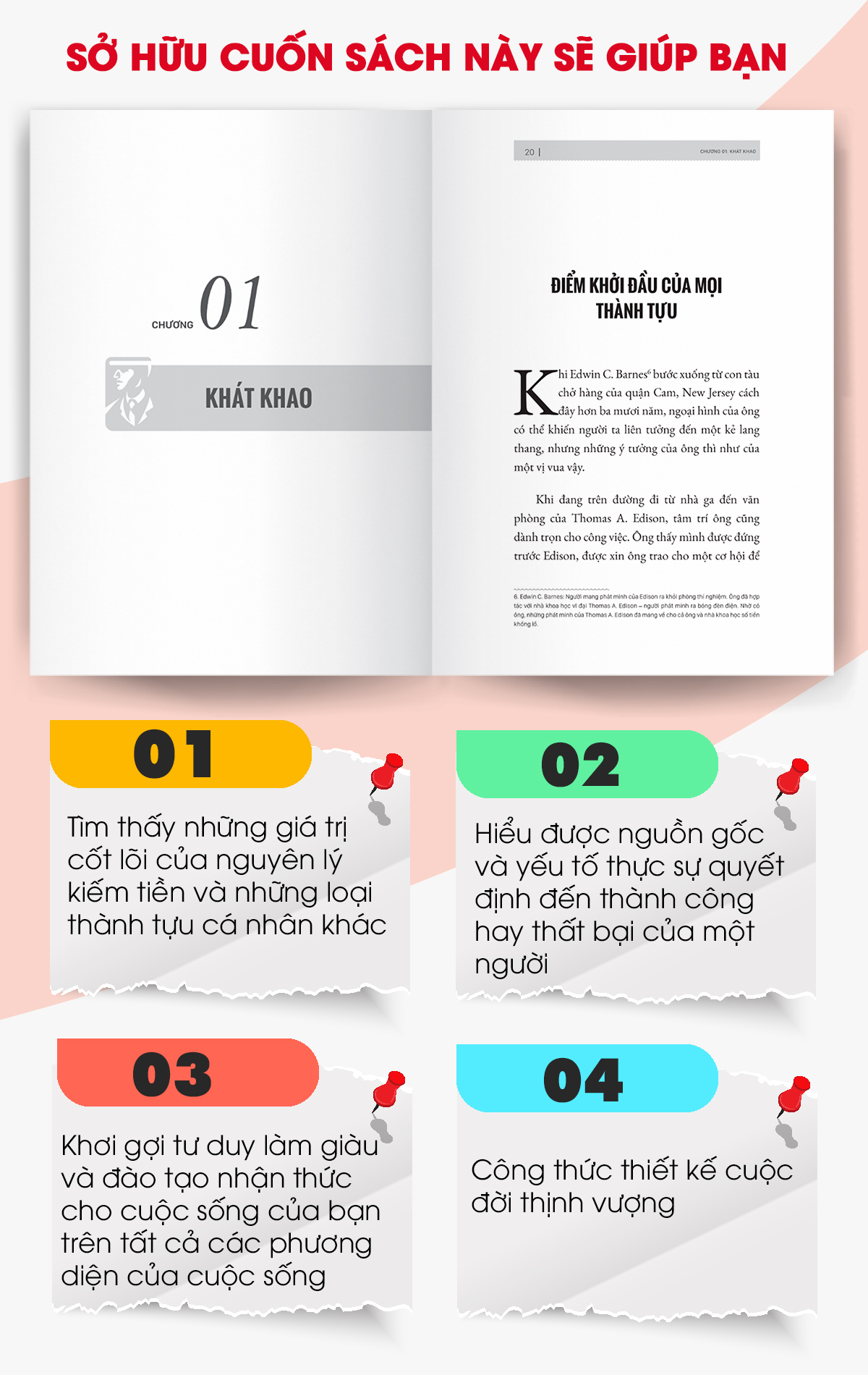 • Cuốn sách "5 nguyên tắc vàng nghĩ giàu làm giàu - Đánh thức khao khát làm giàu trong bạn" nhấn mạnh đến những sức mạnh kì diệu của khối óc: khả năng khát khao cho một mục tiêu và quyết tâm gắn bó với nó, để hình dung những phương thức, để kiên định với quyết tâm đạt được mục tiêu, cũng như để có được sự hỗ trợ tinh thần của những người khác nhằm tạo nên thành công.
