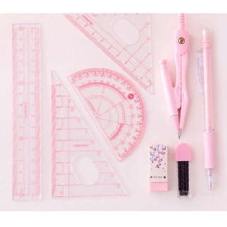 - Bao gồm : compa, ngòi chì, tẩy, thước kẻ, thước eke, thước đo độ đựng trong hộp nhựa