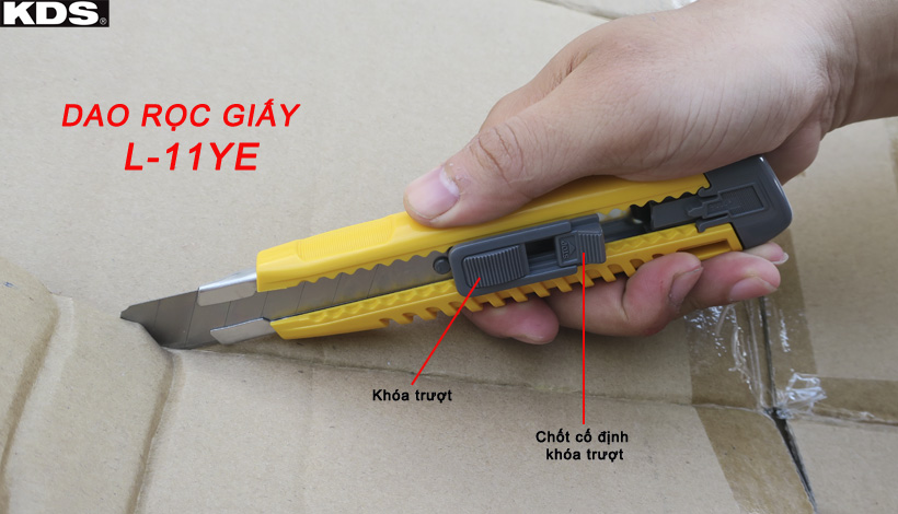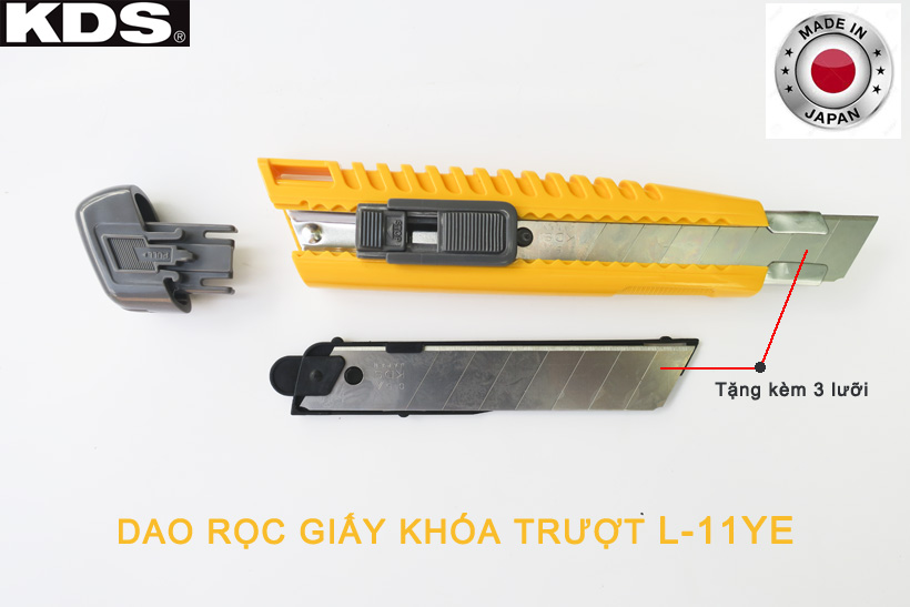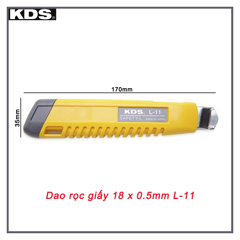- Dao rọc giấy khóa trượt KDS L-11YE đạt tiêu chuẩn chất lượng Công Nghiệp Nhật (JIS). Được thiết kế tinh tế và chú trọng sự an toàn với lưỡi dao được lồng vào trong cán cầm, khi không sử dụng bạn có thể trượt lưỡi dao vào bên trong, đảm bảo an toàn cho bản thân và mọi người. Giúp bạn làm việc cực kỳ an toàn không ảnh hưởng đến người lao động.