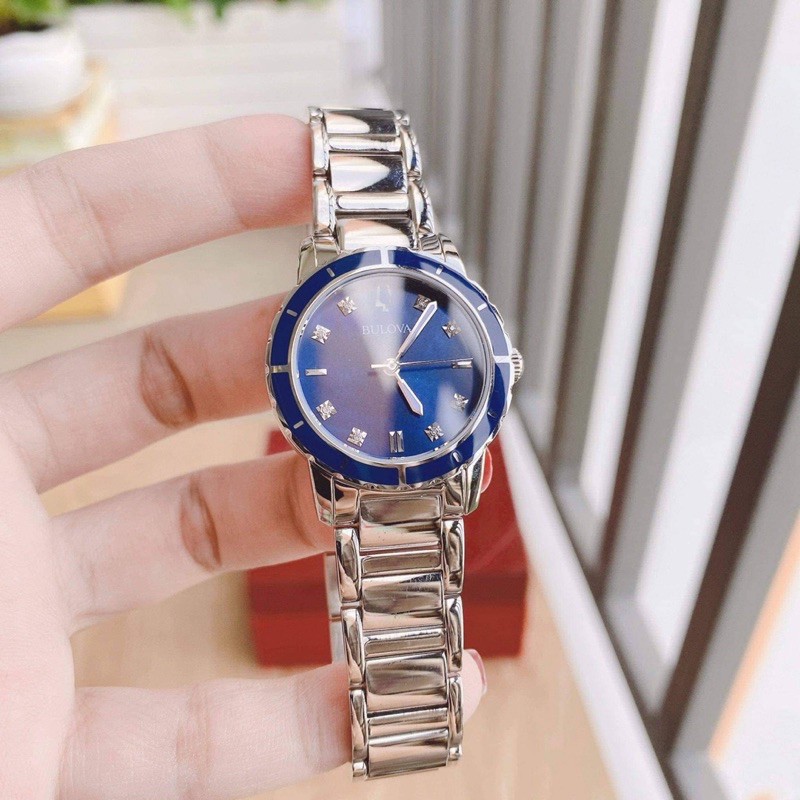 Đồng hồ nữ Bulova 96 màu silver, mặt số xanh làm nổi bật các mốc giờ đính kim cương vô cùng sang trọng, xjnh đẹp. Vỏ thép không ghỉ.