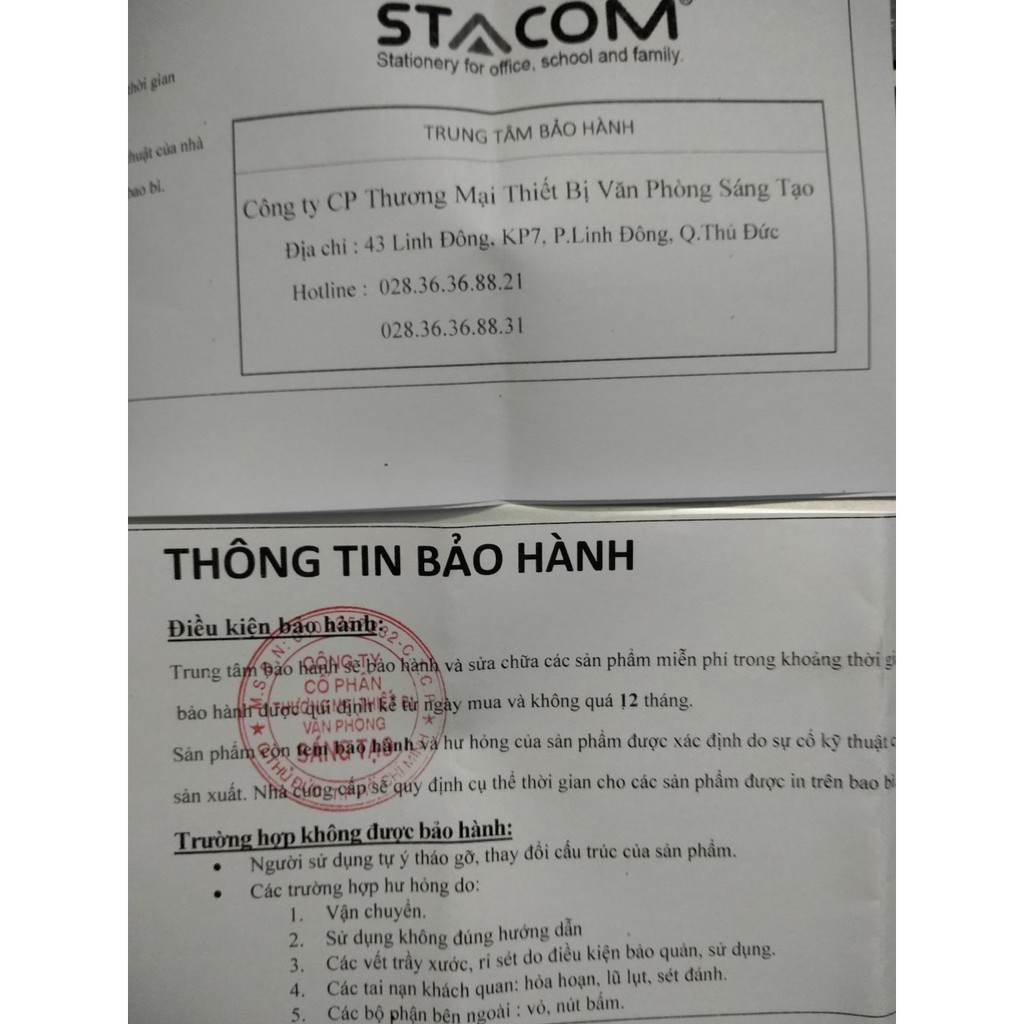 - Trung tâm bảo hành: Cty CP thương mại thiết bị văn phòng Sáng Tạo.