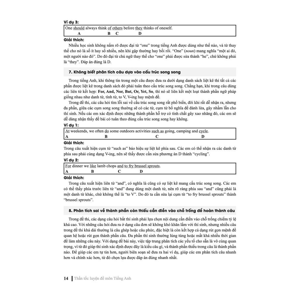 Trong phần thứ nhất, các Thầy Cô đã tổng hợp tất cả những lỗi sai cần tránh trong quá trình làm bài thi môn thi Tiếng Anh như xác định sai thì, sai loại ngữ pháp,... Không chỉ chỉ ra những sai lầm này mà mỗi vấn đề đều kèm thêm ví dụ minh họa, phân tích và chỉ dẫn kĩ lưỡng. Nhờ đó, học sinh sẽ hạn chế được tối đa những lỗi sai này trong đề thi chính thức
