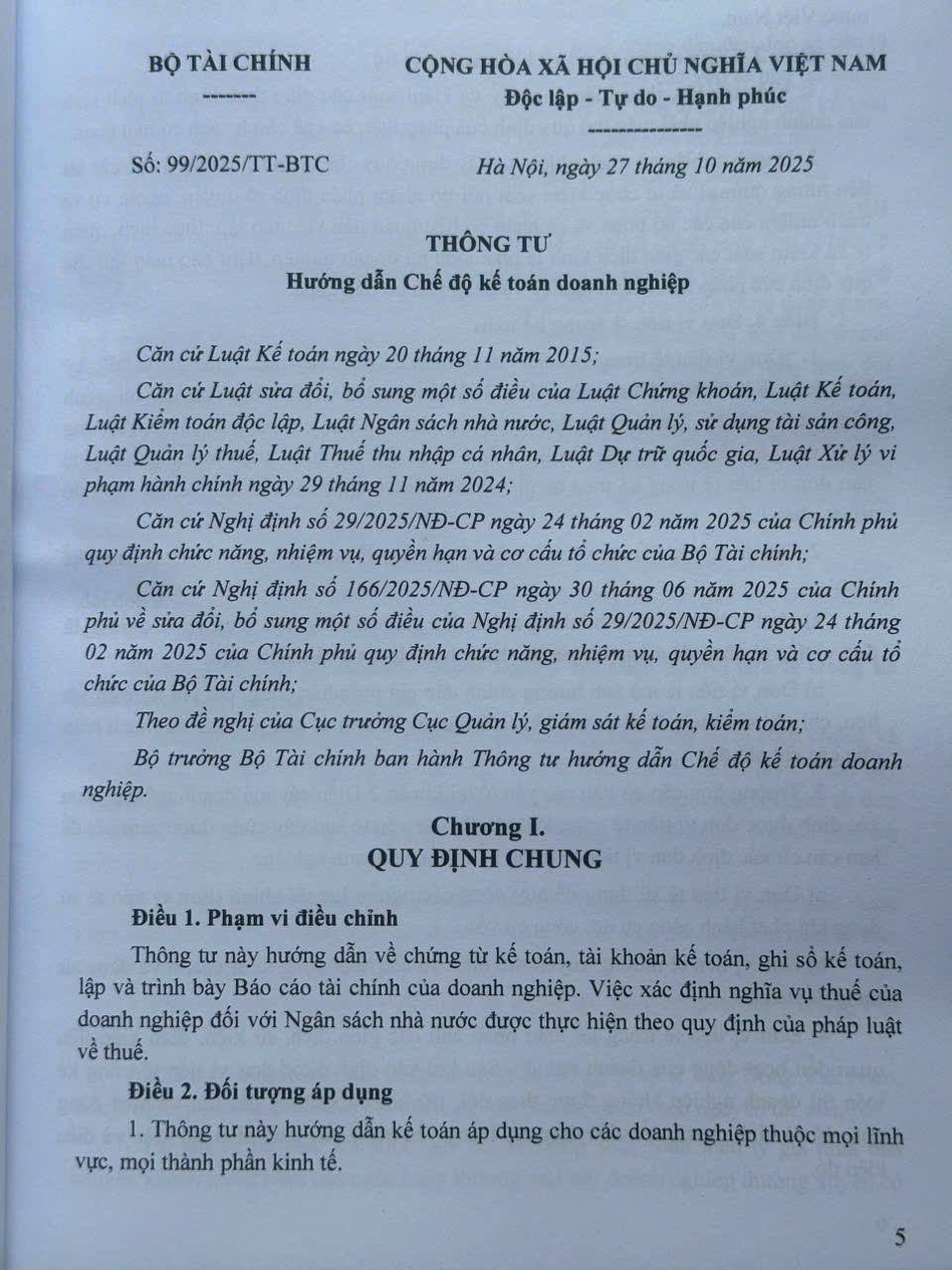 Ngày 27 tháng 10 năm 2025, Bộ Tài chính đã chính thức ban hành Thông tư số 99/2025/TT-BTC hướng dẫn Chế độ kế toán doanh nghiệp. Nội dung Thông tư hướng dẫn áp dụng chứng từ kế toán, tài khoản kế toán, ghi sổ kế toán, lập và trình bày Báo cáo tài chính của doanh nghiệp thuộc mọi lĩnh vực, mọi thành phần kinh tế.