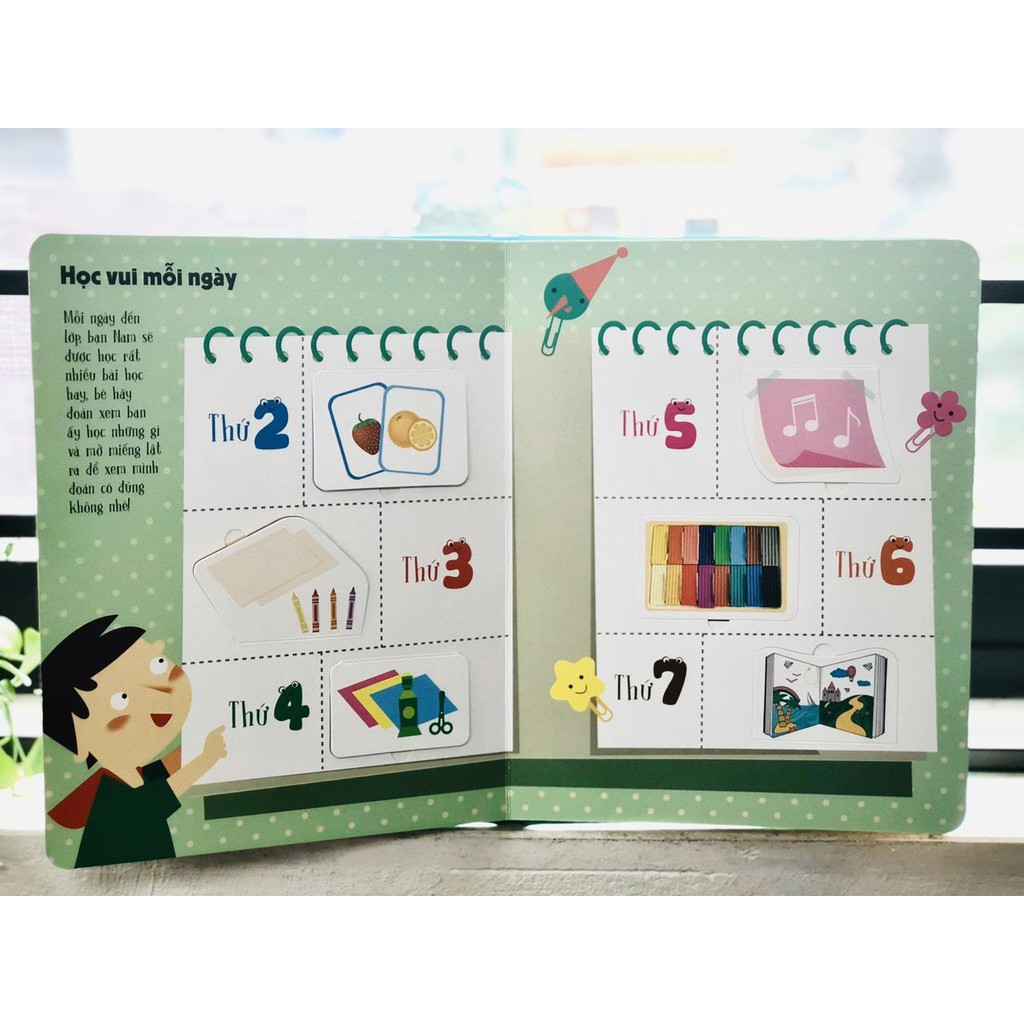 Bố mẹ và bé hãy MỞ cuốn sách này ra rồi LẬT những miếng ghép lên để cùng HỌC rất nhiều từ song ngữ Việt - Anh về chủ đề nhà trẻ nhé! Sẽ cực kỳ vui và bổ ích đấy!