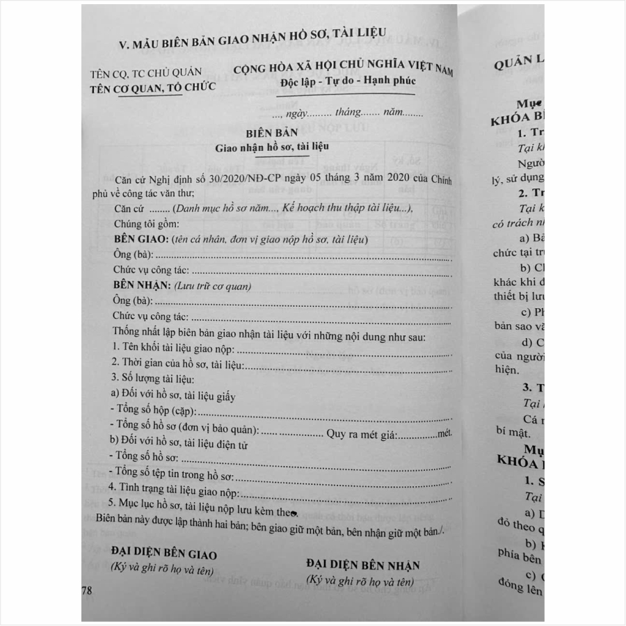 Nhằm nâng cao nghiệp vụ của công tác vănthư, lưutrữ trong việc soạn thảo, ký ban hành văn bản; quản lý văn bản; lập hồ sơ và nộp lưu hồ sơ, tài liệu vào Lưu trữ cơ quan; quản lý và sử dụng condấu, thiết bị lưu khóa bí mật; hướng dẫn hoạt động thu thập, chỉnh lý, xác định giá trị, thời hạn bảo quản, thống kê, sử dụng tài liệu lưu trữ… Nhà sách Nam Việt xin trân trọng giới thiệu cuốn sách: Nghiệp Vụ Văn Thư, Lưu Trữ – Quy Định Thời Hạn Bảo Quản Hồ Sơ, Tài Liệu Hình Thành Trong Hoạt Động Của Cơ Quan, Tổ Chức, Doanh Nghiệp
