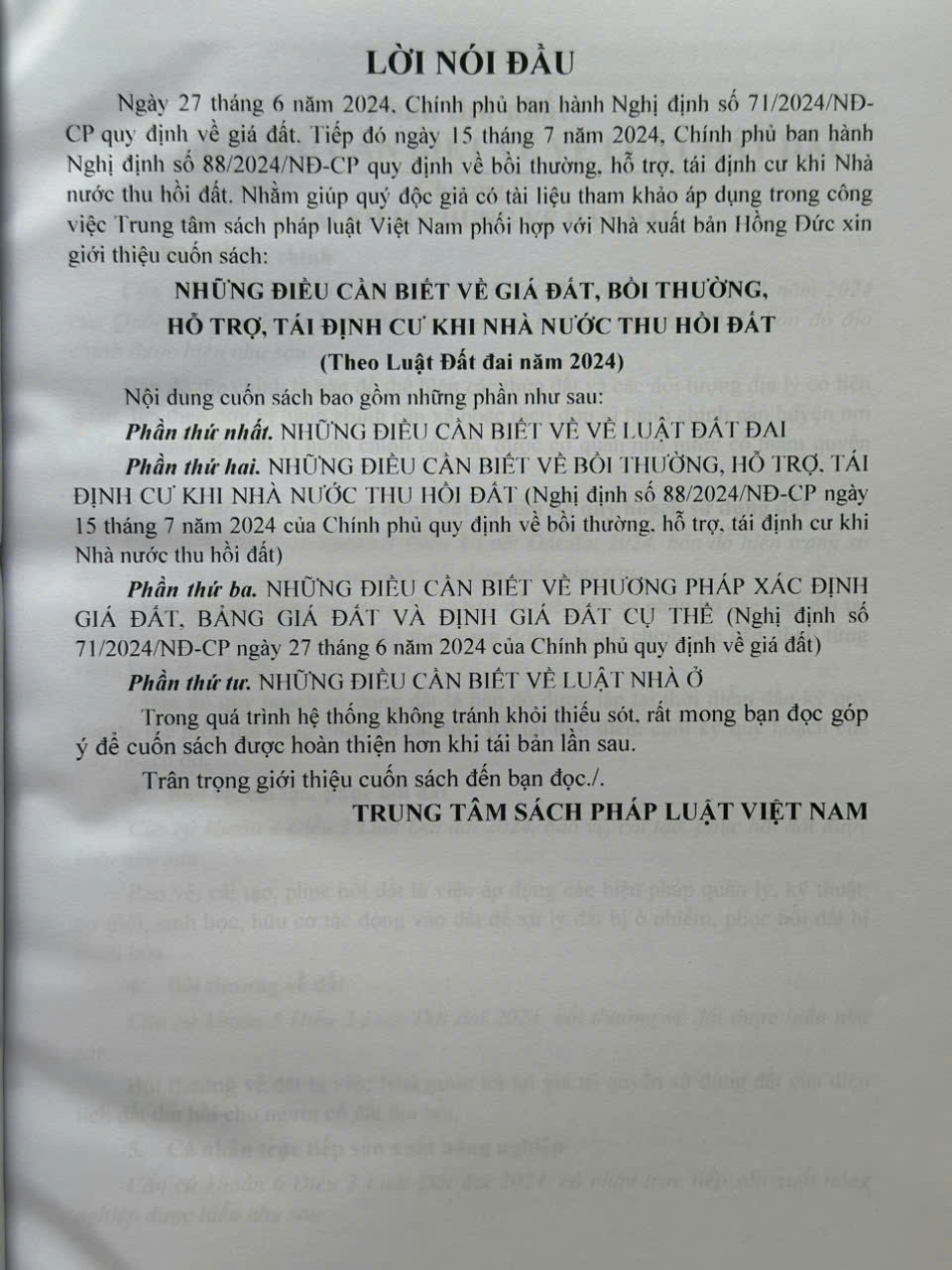 Nhằm phổ biến đến Quý Cơ quan, Đơn vị và Quý khách hàng thân thiết nắm bắt kịp thời những quy định mới nêu trên. Nhà sách Nam Việt xin trân trọng giới thiệu cuốn sách: Những Điều Cần Biết Về Giá Đất, Bồi Thường, Hỗ Trợ, Tái Định Cư Khi Nhà Nước Thu Hồi Đất theo Luật Đất Đai năm 2024