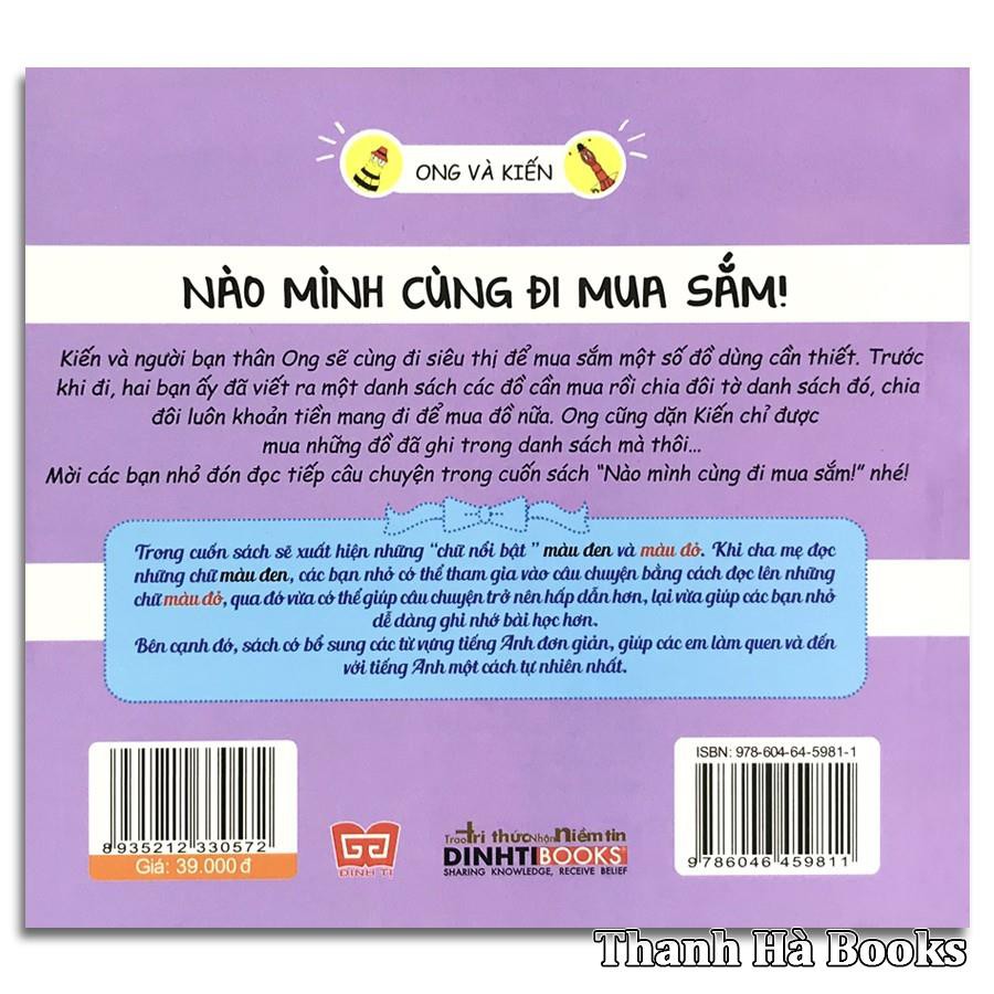 "Nào Mình Cùng Đi Mua Sắm" Ong và người bạn thân Kiến sẽ cùng đi siêu thị để mua sắm một số đồ dùng cần thiết. Trước khi đi, hai bạn ấy đã viết ra một danh sách các đồ cần mua rồi chia đôi tờ danh sách đó, chia đôi luôn khoản tiền mang đi để mua đồ nữa. Ong cũng dặn Kiến chỉ được mua những đồ đã ghi trong danh sách mà thôi... Mời các bạn nhỏ đón đọc tiếp câu chuyện trong cuốn sách “Nào Mình Cùng Đi Mua Sắm” nhé!