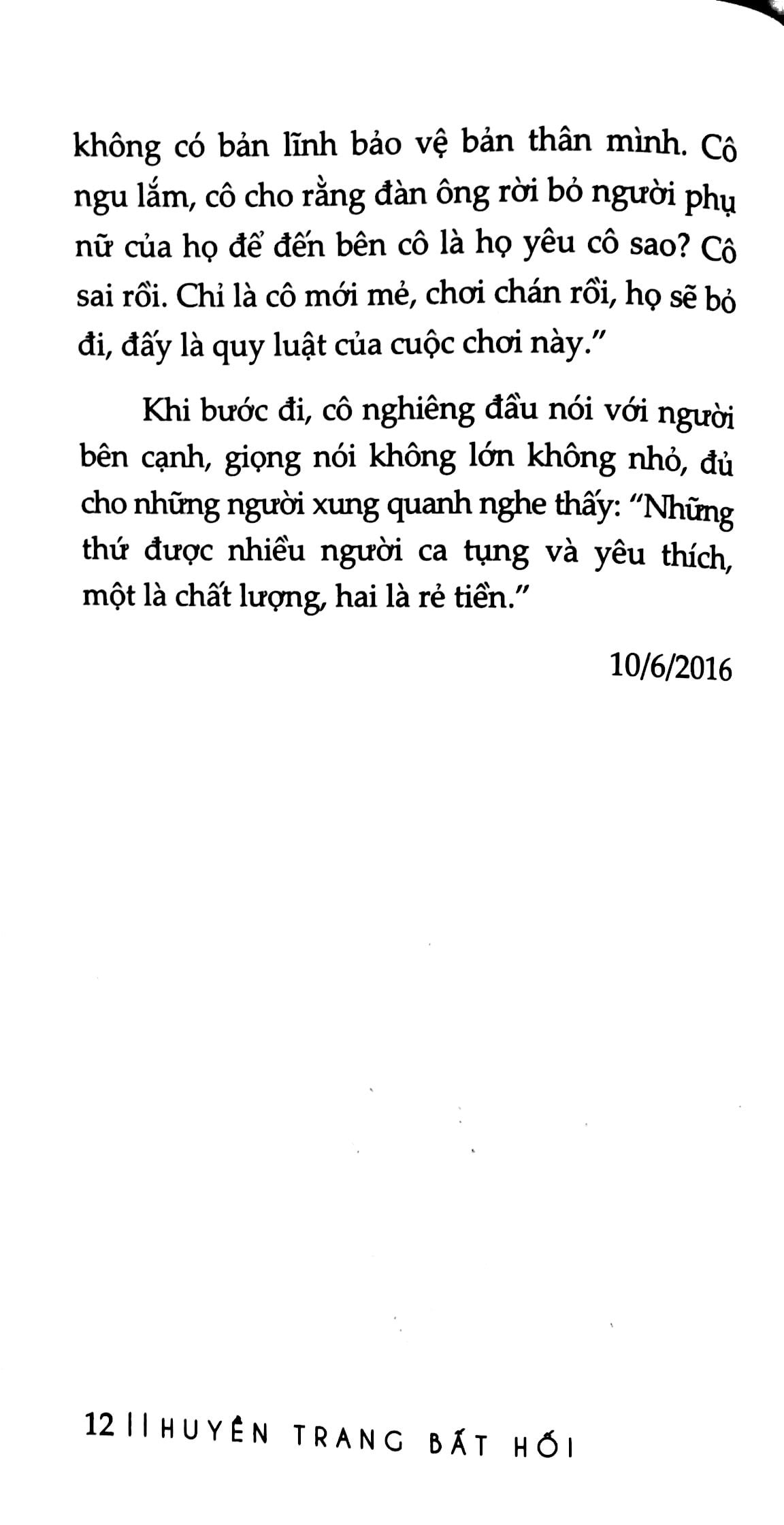 Những người phụ nữ trong Phụ nữ vạn người mê đến khi đạt được điều họ mong muốn, đến khi nắm được trong tay mộng tưởng của mình, ngoảnh đầu nhìn lại phía sau, họ có thật sự hài lòng và hạnh phúc hay không? Vạn người mê, vạn người mê thì sao chứ, chắc gì người mình muốn, mình cần, mình thích cũng sẽ yêu và thương mình? Trăm người cần thì sao chứ, lòng lại chỉ cần một người duy nhất! Đôi nét tác giả Tác giả: Trịnh Huyền Trang Bút danh: Huyền Trang Bất Hối Ngày sinh: 27/12 Câu nói yêu thích: Kiếp này không oán, không hối. Tôi chỉ muốn viết ra những trang sách, tựa như tiếng nói tâm hồn của mình, hệt như đại dương mênh mông, hệt như vực sâu ngàn trượng. Không thể ngỏ lời, không thể họa, chỉ có thể hạ bút. “Phụ nữ đôi khi không cần vạn người mê, chỉ cần một người thương, không cần trăm người hiểu, chỉ cần một người yêu.”