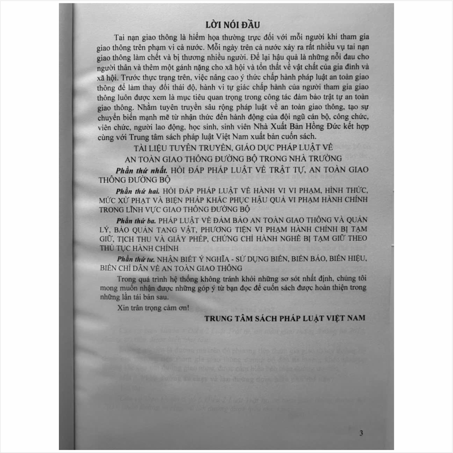 Tai nạn giao thông là hiểm họa thường trực đối với mỗi người khi tham gia giao thông trên phạm vi cả nước. Mỗi ngày trên cả nước xảy ra rất nhiều vụ tai nạn giao thông làm chết và bị thương nhiều người. Để lại hậu quả là những nỗi đau cho người thân và thêm một gánh nặng cho xã hội và tổn thất về vật chất của gia đình và xã hội. Trước thực trạng trên, việc nâng cao ý thức chấp hành pháp luật an toàn giao thông để làm thay đổi thái độ, hành vi tự giác chấp hành của người tham gia giao thông luôn được xem là mục tiêu quan trọng trong công tác đảm bảo trật tự an toàn giao thông. Nhằm tuyên truyền sâu rộng pháp luật về an toàn giao thông, tạo sự chuyển biến mạnh mẽ từ nhận thức đến hành động của đội ngũ cán bộ, công chức, viên chức, người lao động, học sinh, sinh viên. Nhà sách Nam Việt xin trân trọng giới thiệu cuốn sách: Tài Liệu Tuyên Truyền, Giáo Dục Pháp Luật Về An Toàn Giao Thông Đường Bộ Trong Nhà Trường