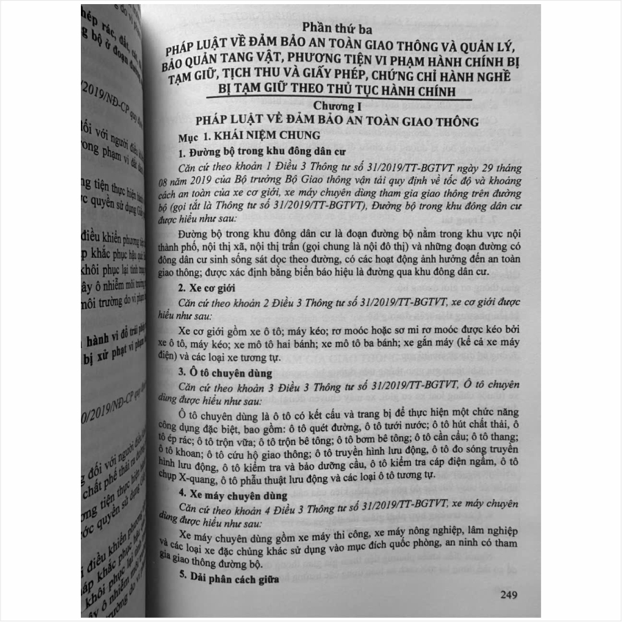Phần thứ ba. PHÁP LUẬT VỀ ĐẢM BẢO AN TOÀN GIAO THÔNG VÀ QUẢN LÝ, BẢO QUẢN TANG VẬT, PHƯƠNG TIỆN VI PHẠM HÀNH CHÍNH BỊ TẠM GIỮ, TỊCH THU VÀ GIẤY PHÉP, CHỨNG CHỈ HÀNH NGHỀ BỊ TẠM GIỮ THEO THỦ TỤC HÀNH CHÍNH