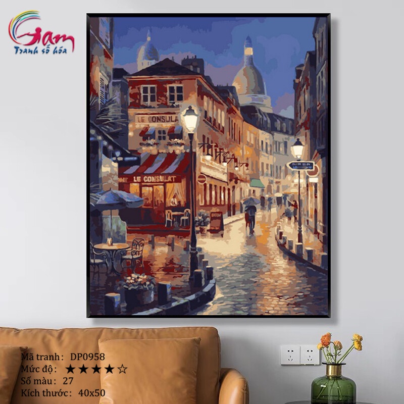 Giới thiệu Tranh tự vẽ tự tô màu theo số sơn dầu số hóa Gam cảnh đêm đường phố phố cổ Châu Âu DP0958