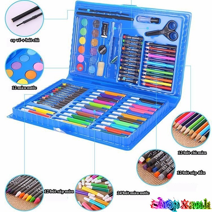 -👉Bộ sản phẩm đa dạng thể loại: bút chì màu, màu sáp, màu nước, cọ, tẩy.